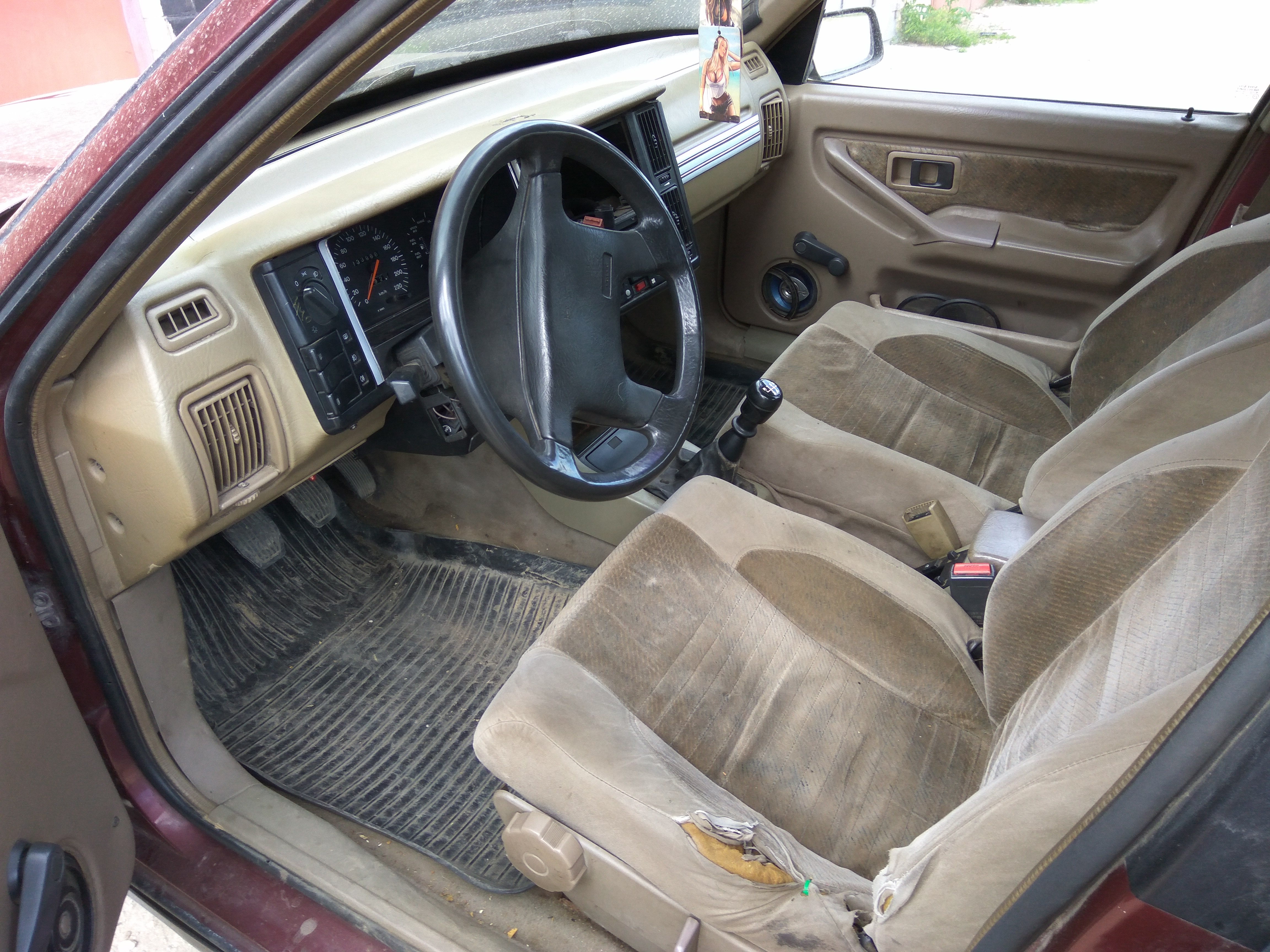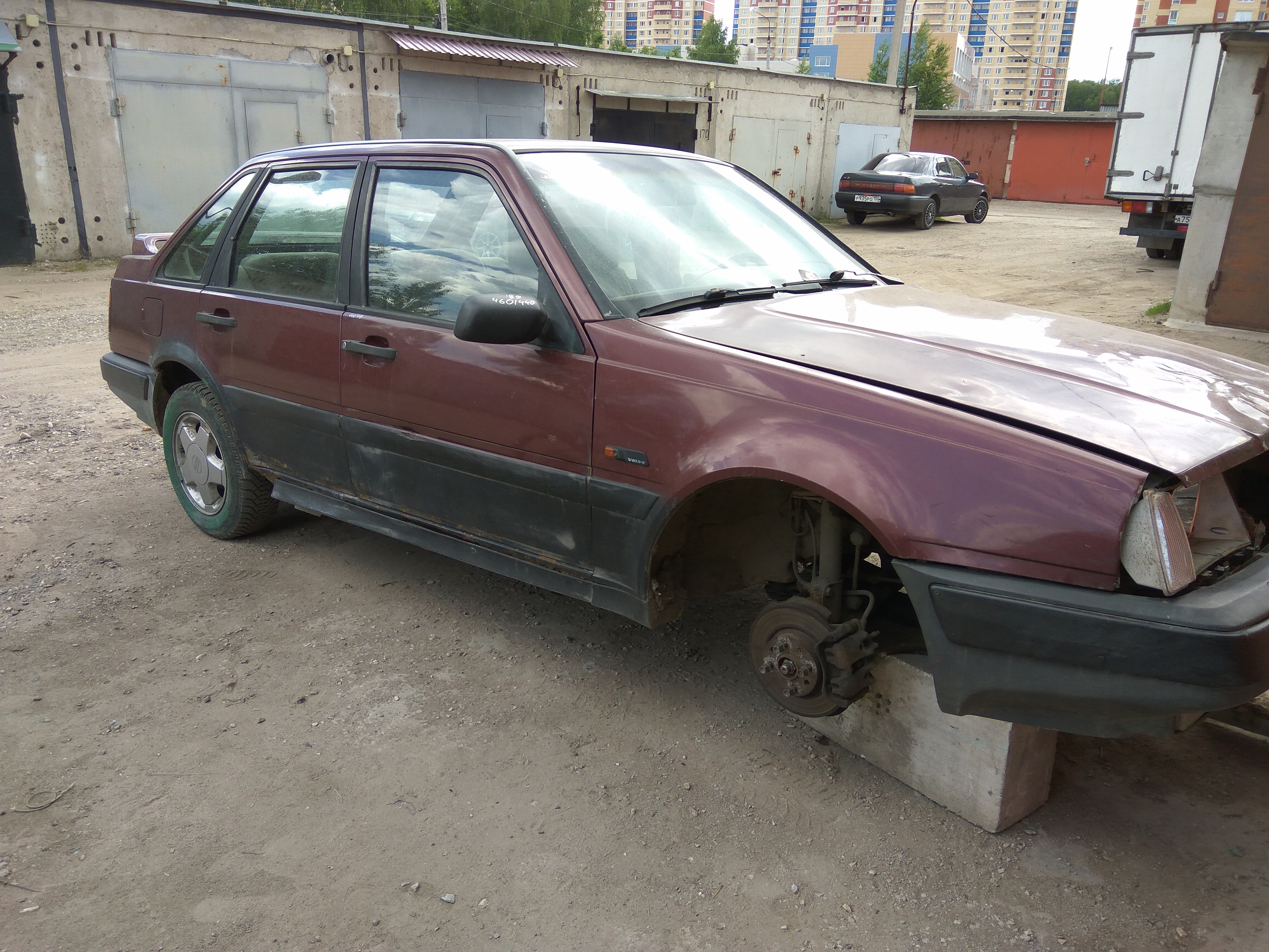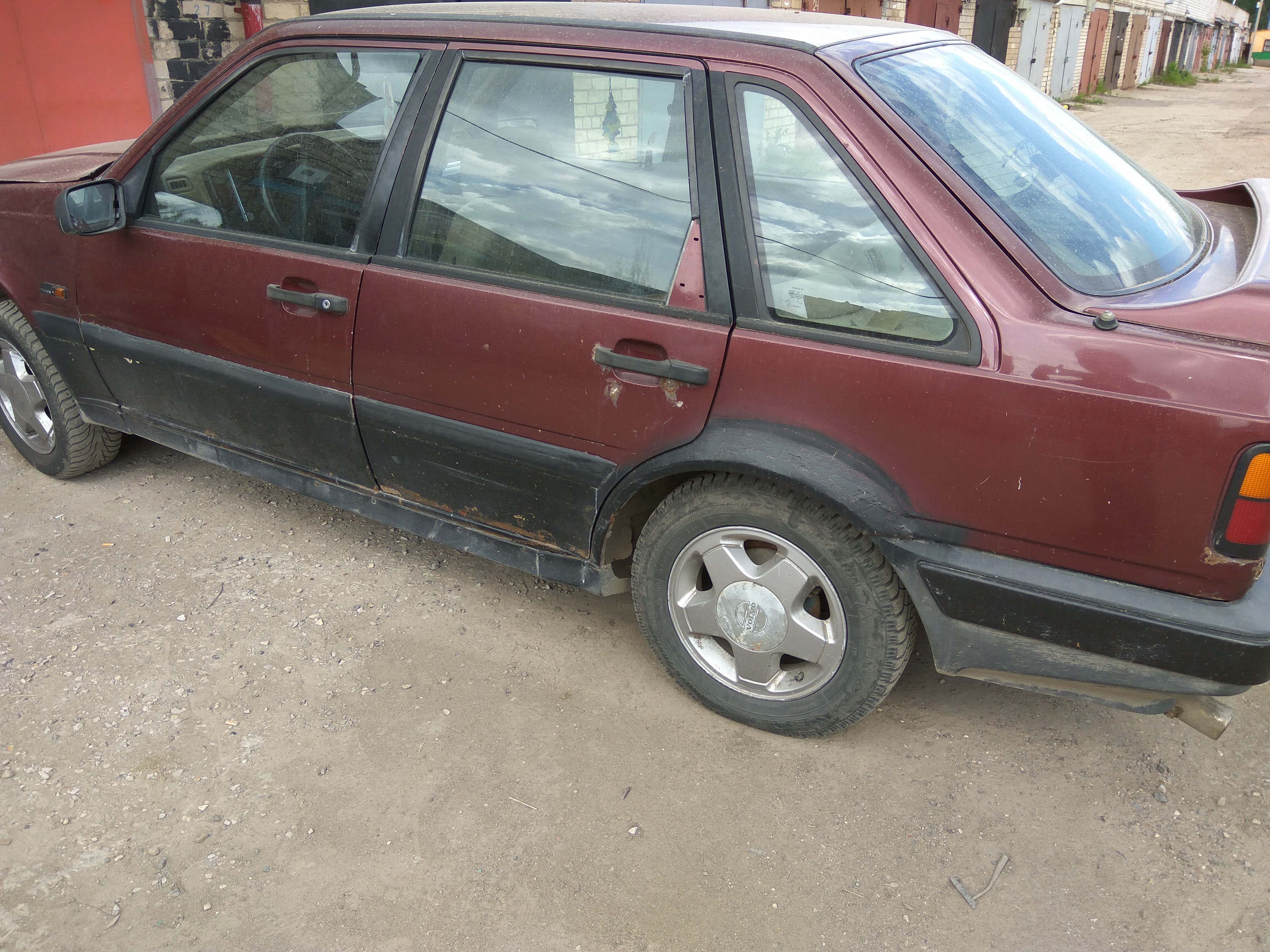 Volvo 440 1989 года, механическая коробка передач, передние крылья без ржавчины, целые фонари, зеркала с незначительными дефектами, сам кузов гниловат, приборная панель в хорошем состоянии, турбина снята.